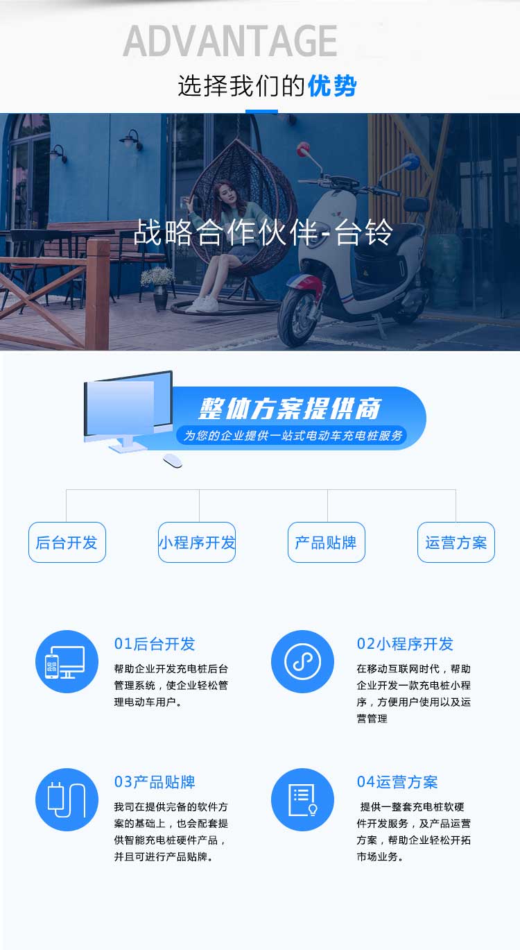 動車、智能充電樁、智能充電柜、電動車銷售與售后平臺,致力于打造一套完整的電動車生態(tài)圈,為客戶提供電動車從購買到使用、充換電及售后乖全方位的產(chǎn)品體驗(yàn)。